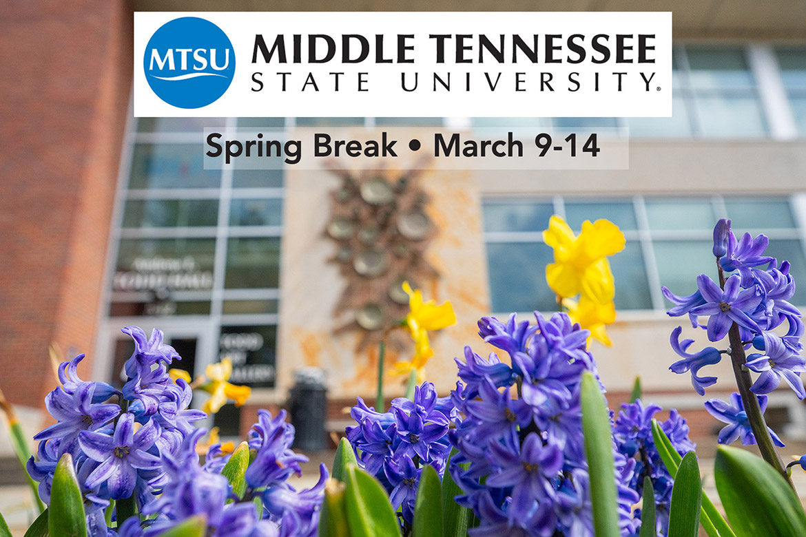 Middle Tennessee State University students and faculty will be on spring break from Monday-Saturday, March 9-14. Classes will resume on Monday, March 16.[ Read More ]